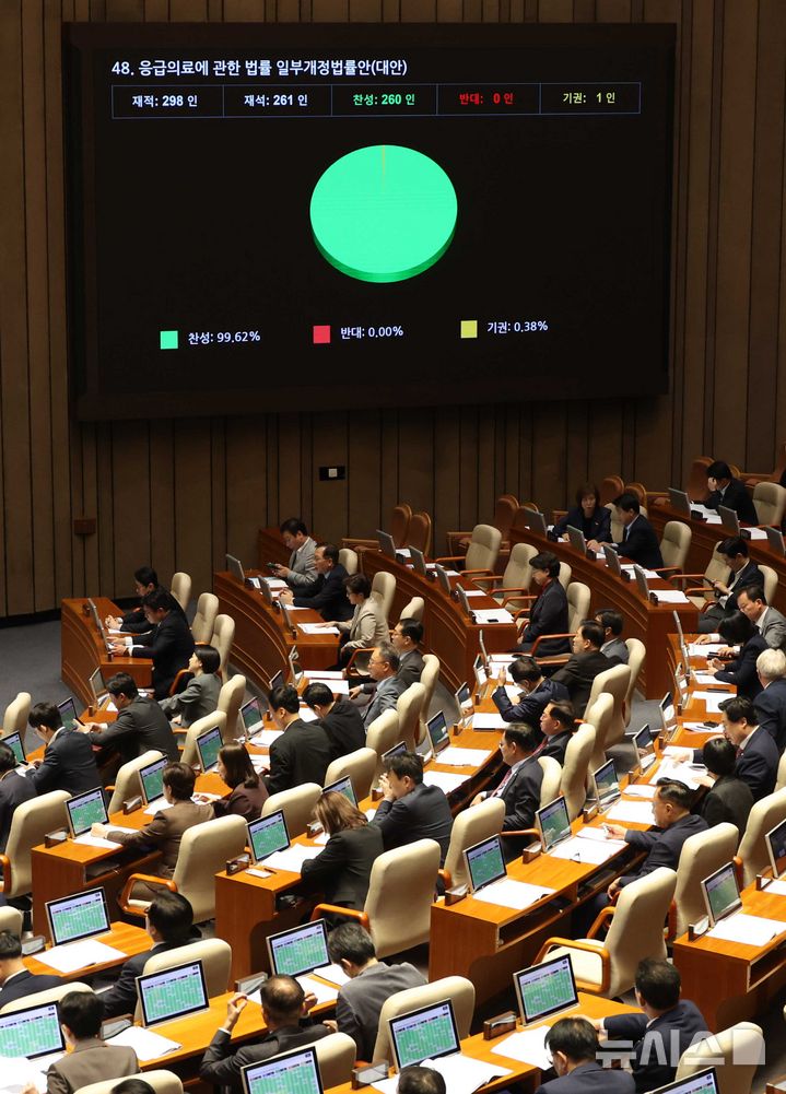 [서울=뉴시스] 조성봉 기자 = 26일 오후 서울 여의도 국회 본회의장에서 열린 제429회 국회(정기회) 제10차 본회의에서 응급의료에 관한 법률 일부개정법률안(대안)이 가결되고 있다. 2025.10.26. [email protected]