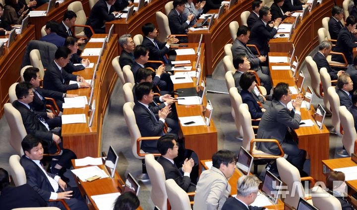 [서울=뉴시스] 조성봉 기자 = 26일 오후 서울 여의도 국회 본회의장에서 열린 제429회 국회(정기회) 제10차 본회의에서 근로자의 날 제정에 관한 법률 전부개정법률안(대안)이 가결되자 의원들이 박수를 치고 있다. 2025.10.26. [email protected]