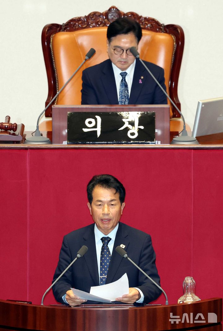 [서울=뉴시스] 조성봉 기자 = 윤종오 진보당 원내대표가 26일 오후 서울 여의도 국회 본회의장에서 열린 제429회 국회(정기회) 제10차 본회의에서 자유발언을 하고 있다. 윤 원내대표는 "고리2호기 수명연장, 부산·울산·경남 380만 명 볼모로 한 도박"이라고 지적했다. 2025.10.26. [email protected]