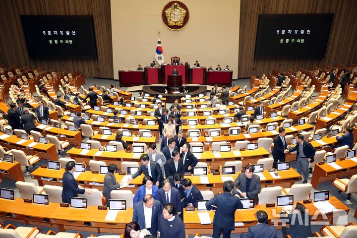 [서울=뉴시스] 조성봉 기자 = 윤종오 진보당 원내대표가 26일 오후 서울 여의도 국회 본회의장에서 열린 제429회 국회(정기회) 제10차 본회의에서 자유발언을 하고 있는 가운데 의원들이 밖으로 나서고 있다. 윤 원내대표는 "고리2호기 수명연장, 부산·울산·경남 380만 명 볼모로 한 도박"이라고 지적했다. 2025.10.26. [email protected]