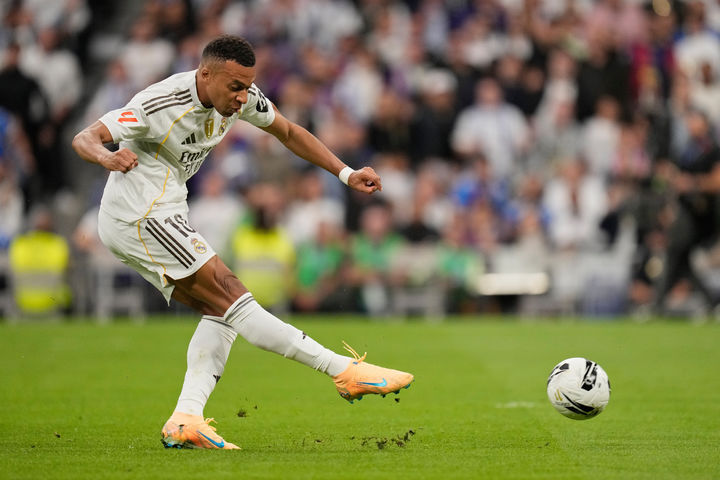 [마드리드=AP/뉴시스] 레알 마드리드의 킬리안 음바페가 26일(현지 시간) 스페인 마드리드의 산티아고 베르나베우에서 열린 2025-26 라리가 10라운드 바르셀로나와 경기 전반 22분 선제골을 넣고 있다. 레알 마드리드가 2-1로 이기고 바르셀로나와 승점을 5점 차로 벌리며 1위를 고수했다. 2025.10.27.