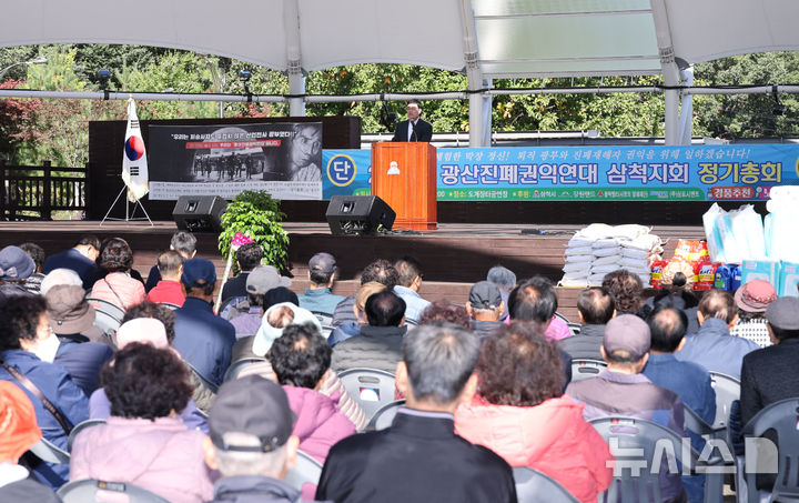 [삼척=뉴시스] 홍춘봉 기자 = 27일 강원 삼척시 도계장터 애외공연장에서 열린 2025년 광산진폐권익연대 정기총회에 참석한 박상수 삼척시장이 인사말을 하고 있다.(사진=삼척시 제공)[email protected]