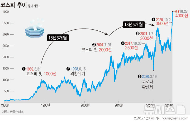 [서울=뉴시스] 27일 한국거래소에 따르면 코스피 지수는 전 거래일 보다 2.57%(101.24포인트) 오른 4042.83포인트에 거래를 마쳤다. 종가 기준 4000선은 2021년 1월 6일 처음 3000선을 돌파한 이후 약 4년 10개월 만이다. 국내 시가총액 1위 삼성전자 주가는 3.24% 오른 10만2000원에 마감하며, 사상 처음으로 '10만전자'를 달성했다. (그래픽=안지혜 기자)