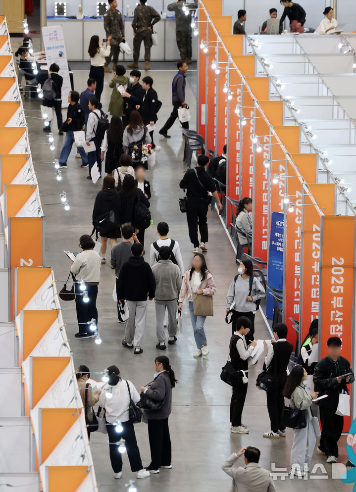 [부산=뉴시스] 하경민 기자 = '2025 부산 잡(JOB) 페스티벌'이 열린 27일 부산 해운대구 벡스코 제1전시장에서 구직자들이 구인업체 부스에서 현장면접을 보거나 채용상담을 하고 있다.