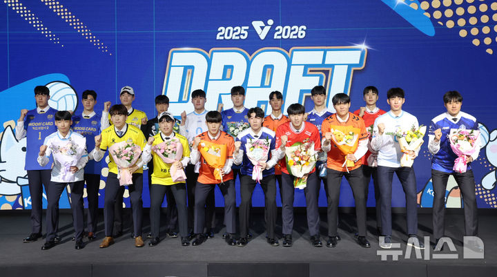[서울=뉴시스] 조성우 기자 = 27일 서울 강서구 메이필드 호텔에서 열린 2025-2026 한국배구연맹(KOVO) 남자 신인선수 드래프트에서 각 구단에 지명을 받은 선수들이 기념촬영을 하고 있다.  뒷줄 오른쪽부터 1라운드 1순위 방강호(OK저축은행), 2순위 이우진(삼성화재), 3순위 박인우(OK저축은행), 4순위 손유민(우리카드), 5순위 이준호(대한항공), 6순위 장아성(현대캐피탈), 7순위 임동균(KB손해보험). 2025.10.27. [email protected]
