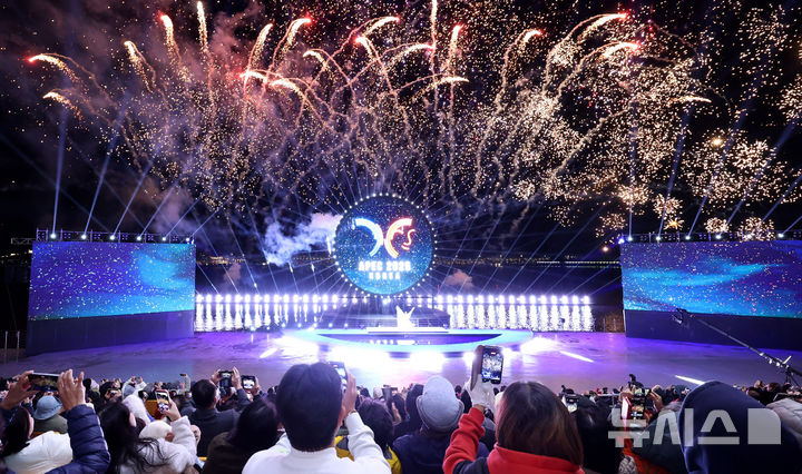 [경주=뉴시스] 추상철 기자 = APEC 2025 코리아 주간이 시작된 27일 오후 경북 경주시 보문호수 수상공연장에서 열린 '보문 멀티미디어쇼 특별공연'에서 멀티미디어 공연쇼가 펼쳐지고 있다. 2025.10.27. [email protected]
