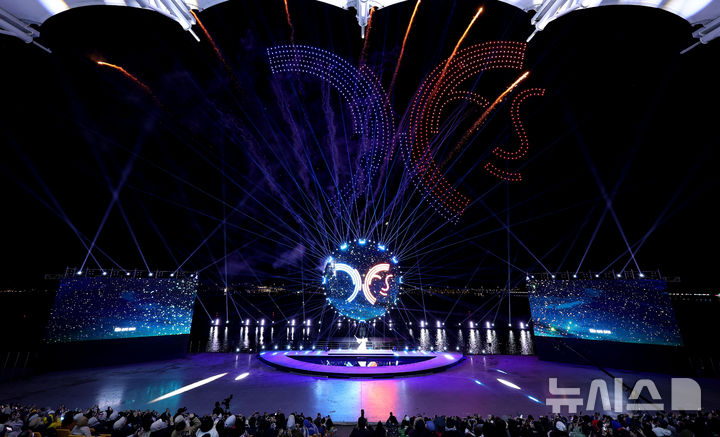 [경주=뉴시스] 이무열 기자 = 2025 경주 아시아태평양경제협력체(APEC) 정상회의 기념 멀티미디어쇼가 27일 경북 경주시 보문 관광단지 수상공연장에서 열려 미디어아트와 레이저, 불꽃쇼, 드론쇼 등을 활용한 경관쇼가 보문호 밤하늘을 수놓고 있다. 2025.10.27. [email protected]