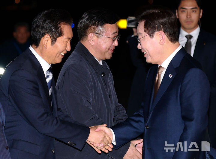 [성남=뉴시스] 고범준 기자 = 아세안 정상회의 일정을 마친 이재명 대통령이 27일 경기 성남 서울공항에 도착해 정청래 더불어민주당 대표와 인사하고 있다. 2025.10.27. [email protected]