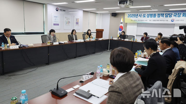 [서울=뉴시스] 김명원 기자 = 원민경 성평등가족부 장관이 28일 서울 종로구 정부서울청사에서 열린 시·도 성평등정책업무 담당국장 회의에 참석해 발언하고 있다. 2025.10.28. [email protected]