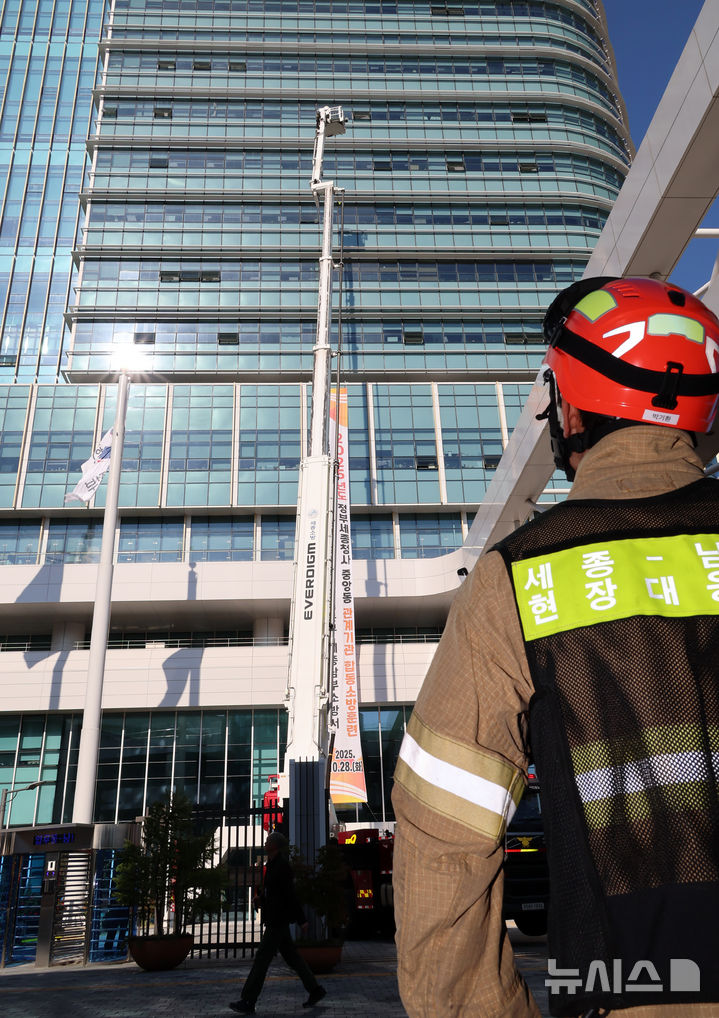 [세종=뉴시스] 강종민 기자 = 28일 세종시 정부세종청사 중앙동에서 열린 관계기관 합동 소방훈련에서 고가사다리 소방차 방수 및 인명 구조훈련이 진행되고 있다. 2025.10.28. [email protected]