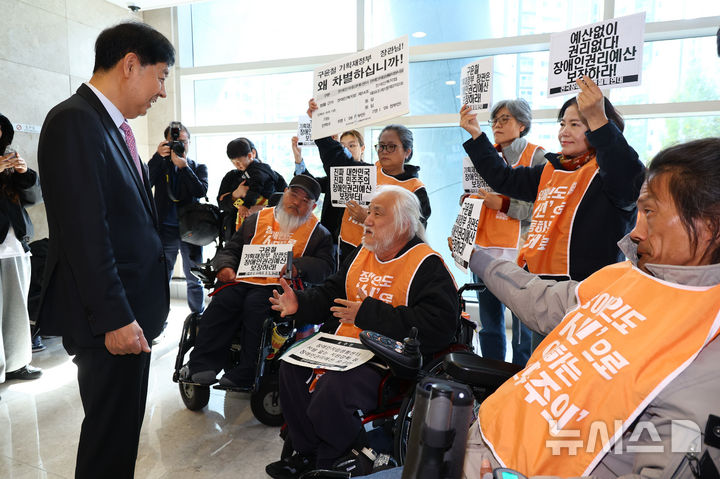 [서울=뉴시스] 황준선 기자 = 구윤철 경제부총리 겸 기획재정부 장관이 28일 오후 서울 마포구 누리꿈스퀘어에서 열린 공공기관 AI 대전환(AX) 워크숍 행사장에서 면담을 요구하며 점거 농성 중이던 박경석 전국장애인차별철폐연대 상임대표 및 회원들과 대화하고 있다. 2025.10.28. [email protected]