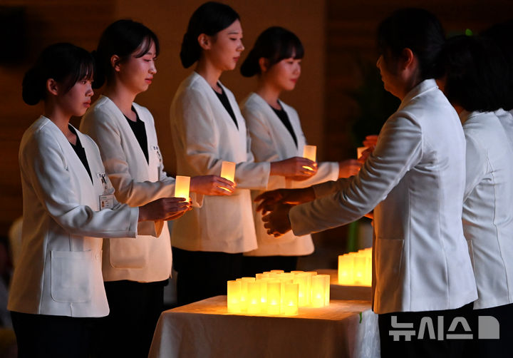이날 선서식에는 나이팅게일로 선출된 간호대학 69명이 '전문간호인으로서 인간의 생명을 존중하고 간호 받는 환우들의 안녕을 위해 헌신할것'을 다짐했다. 2025.10.28. [email protected]
