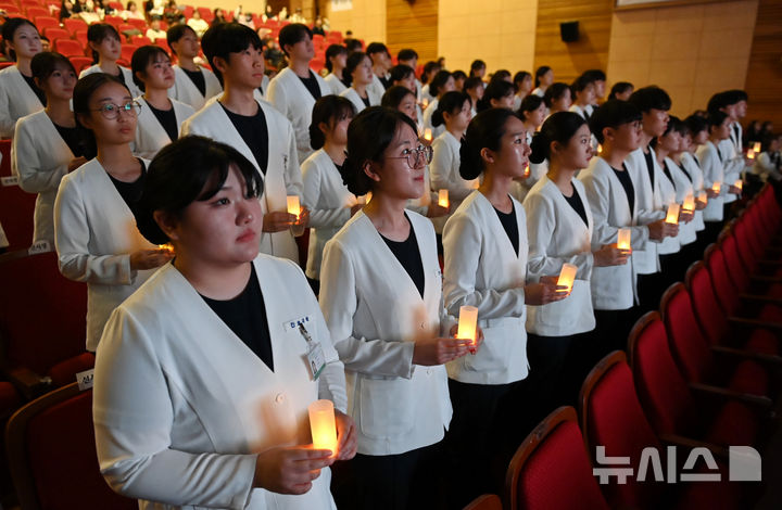 이날 선서식에는 나이팅게일로 선출된 간호대학 69명이 '전문간호인으로서 인간의 생명을 존중하고 간호 받는 환우들의 안녕을 위해 헌신할것'을 다짐했다. 2025.10.28. [email protected]