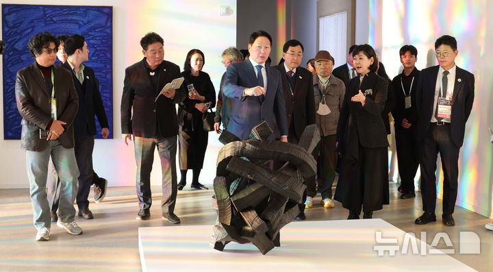 [경주=뉴시스] 추상철 기자 = 최태원 SK그룹 겸 대한상공회의소 회장이 28일 경상북도 경주시 플레이스C 갤러리에서 열린 ‘아시아태평양경제협력체(APEC) 최고경영자(CEO) 서밋, 배우자 미술전시 오프닝’에서 작품을 살펴보고 있다. (공동취재) 2025.10.28. [email protected]
