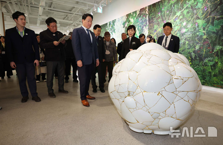 [경주=뉴시스] 추상철 기자 = 최태원 SK그룹 겸 대한상공회의소 회장이 28일 경상북도 경주시 플레이스C 갤러리에서 열린 ‘아시아태평양경제협력체(APEC) 최고경영자(CEO) 서밋, 배우자 미술전시 오프닝’에서 작품을 살펴보고 있다. (공동취재) 2025.10.28. [email protected]