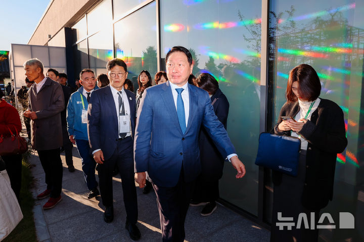 [경주=뉴시스] 추상철 기자 = 최태원 SK그룹 겸 대한상공회의소 회장이 28일 경상북도 경주시 사정동 플레이스C 갤러리에서 열린 ‘아시아태평양경제협력체(APEC) 최고경영자(CEO) 서밋, 배우자 미술전시 오프닝’에 참석해 있다. (공동취재) 2025.10.28. [email protected]