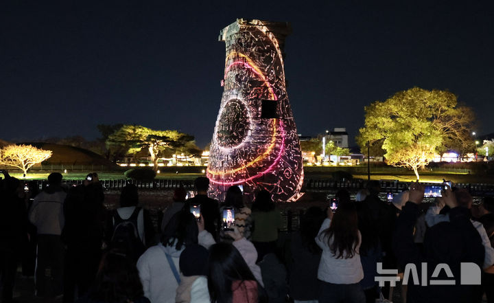 [경주=뉴시스] 추상철 기자 = 아시아태평양경제협력체(APEC) 정상회의 주간인 28일 오후 경북 경주시 대릉원 첨성대에 미디어아트가 펼쳐지고 있다. 2025.10.28. [email protected]