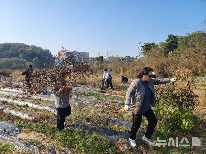 [음성=뉴시스] 충북 음성군 일자리경제과 직원들이 29일 대소면 오류리의 한 농가에서 일손 돕기 봉사를 하고 있다. (사진=음성군 제공) 2025.10.29. [email protected]