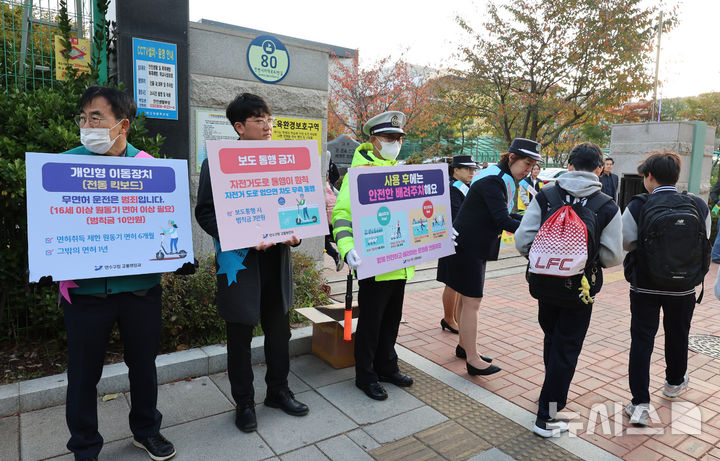 [인천=뉴시스] 전진환 기자 =  29일 오전 인천 연수구 송도동 신정중학교와 연송고등학교  앞에서 연수구와 연수경찰서 직원 및 자원봉사자들이 학생들을 대상으로 '킥보드 안전수칙 캠페인'을 벌이고 있다.