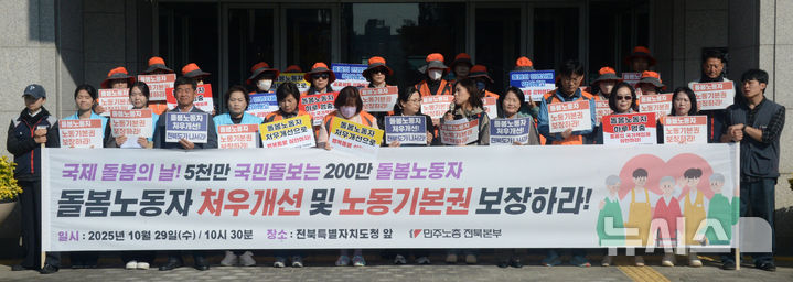 [전주=뉴시스] 김얼 기자 = 민주노총전북본부 관계자들이 29일 전북 전주시 전북특별자치도청 앞에서 '돌봄노동자 처우개선 및 노동기본권 보장' 기자회견을 열고 회견문을 낭독하고 있다. 2025.10.29. [email protected]