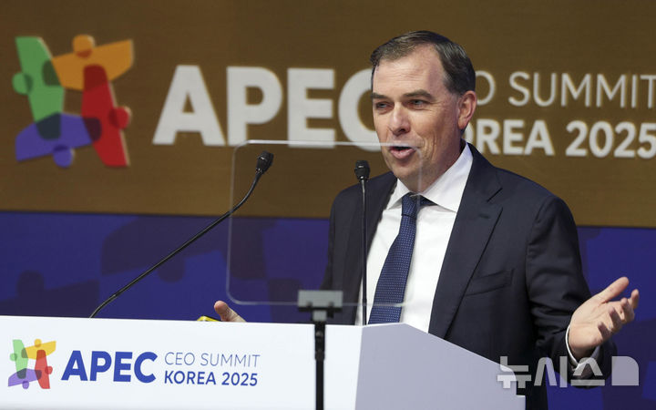 [경주=뉴시스] 추상철 기자 = 맷 가먼 AWS CEO가 29일 경북 경주예술의전당에서 열린 아시아태평양경제협력체(APEC) CEO 써밋에서 주제발표를 하고 있다. (공동취재) 2025.10.29. [email protected]