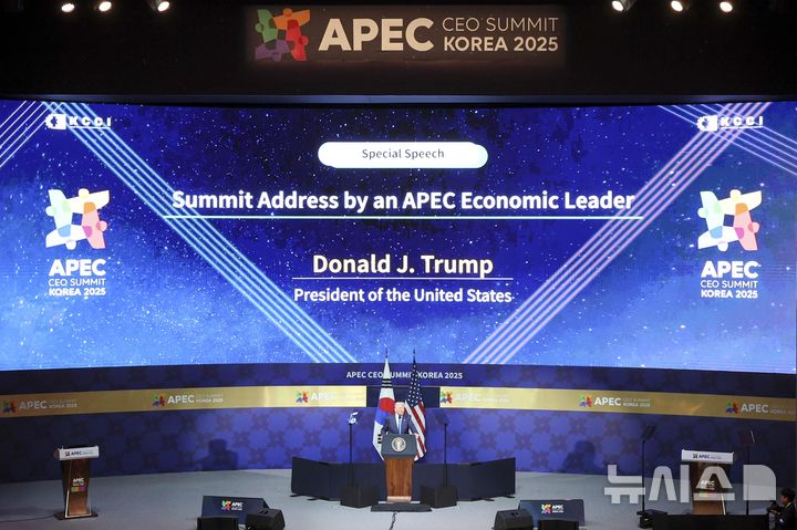 [경주=뉴시스] 추상철 기자 = 도널드 트럼프 미국 대통령이 29일 경북 경주시 경주예술의전당에서 열린 '2025 APEC CEO 서밋'에서 특별 연설을 하고 있다. (공동취재) 2025.10.29. [email protected]