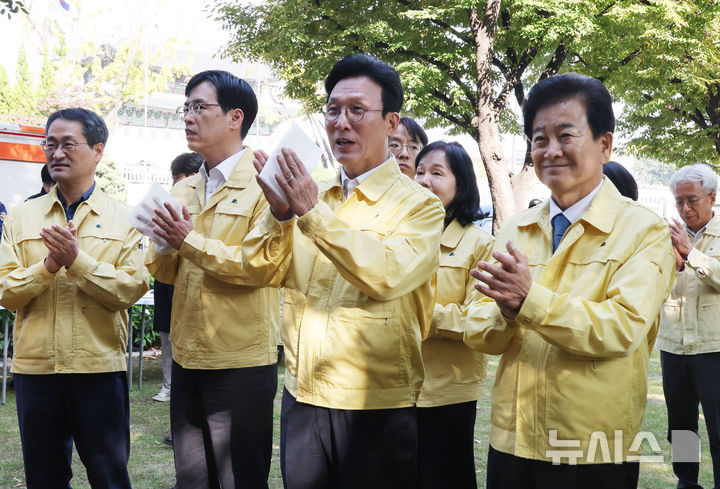 [서울=뉴시스] 김명원 기자 = 김민석 국무총리가 29일 서울 종로구 정부서울청사에서 열린 민방위훈련에서 화재진화 작업을 상황을 지켜보며 박수하고 있다. 2025.10.29. [email protected]