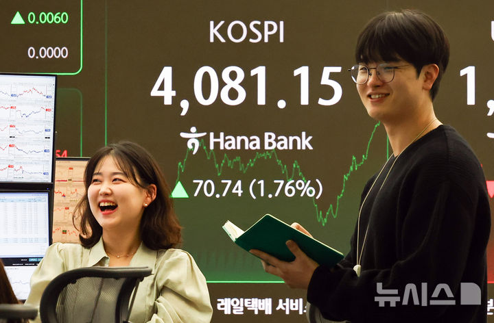 [서울=뉴시스] 최진석 기자 = 코스피가  전 거래일(4010.41)보다 70.74포인트(1.76%%) 오른 4081.15에 마감한 29일 서울 중구 하나은행 딜링룸에 종가가 보이고 있다.