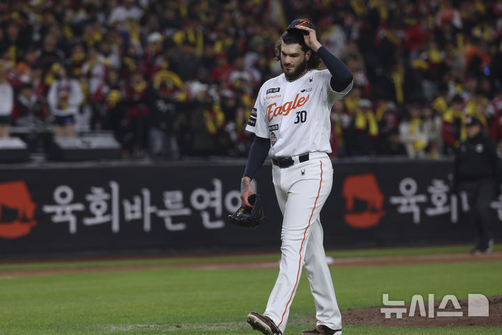 [대전=뉴시스] 김근수 기자 = 29일 대전 중구 한화생명볼파크에서 열린 2025 KBO 한국시리즈 3차전 LG 트윈스와 한화 이글스의 경기, 4회초 한화 선발 폰세가 역전을 허용한 뒤 이닝을 마치고 한숨을 내쉬고 있다. 2025.10.29. [email protected]