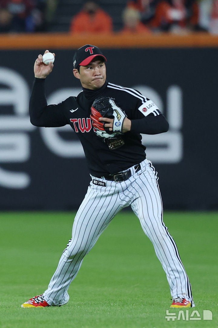 [대전=뉴시스] 조성우 기자 = 29일 대전 중구 한화생명볼파크에서 열린 2025 KBO 한국시리즈 3차전 LG 트윈스와 한화 이글스의 경기, 한화 2회말 공격 1사 주자 1, 2루서 이도윤의 내야 뜬공 때 LG 유격수 오지환이 고의 낙구 후 병살로 연결하고 있다. 2025.10.29. [email protected]