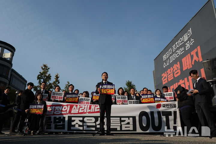 [서울=뉴시스] 김선웅 기자 = 장동혁 국민의힘 대표가 30일 서울 서초구 조은석 특검사무실이 위치한 서울고등검찰청 인근에서 열린 국민의힘 긴급 현장 의원총회에서 규탄 발언을 하고 있다. 2025.10.30. [email protected]