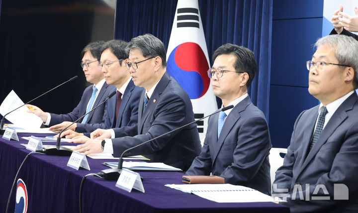 [서울=뉴시스] 김명원 기자 = 김용수 국무조정실 국무2차장이 30일 오전 서울 종로구 정부서울청사에서 부동산 불법행위 대응 관계 부처 합동브리핑을 하고 있다. 왼쪽부터 오상훈 국세청 자산과세국장, 김규철 국토교통부 주택토지실장, 김용수 국무2차장, 신진창 금융위원회 사무처장, 홍석기 경찰청 수사국장. 2025.10.30. [email protected]