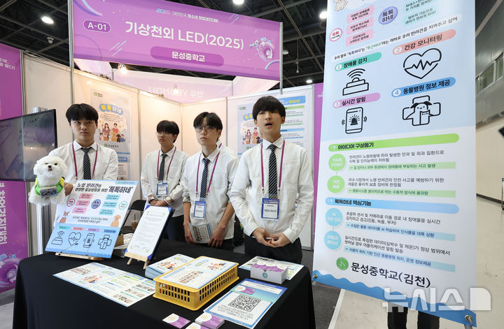 [서울=뉴시스] 김선웅 기자 = 30일 서울 서초구 aT센터에서 열린 2025 대한민국 청소년 창업 경진대회에서 경북 문성중학교 창업동아리 기상천외 LED(2025) 소속 학생들이 노령 반려견의 안전한 일상생활을 위한 AI기반 스마트장치를 소개하고 있다. 2025.10.30. [email protected]