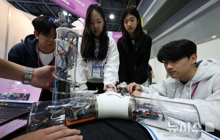[서울=뉴시스] 김선웅 기자 = 30일 서울 서초구 aT센터에서 열린 2025 대한민국 청소년 창업 경진대회에서 서울외국인학교 창업동아리 팀 가이안스 소속 학생들이 방향 전환 내시경과 매립 센서를 통한 데이터 통합한 지반 침하 예측 머신 러닝 시스템을 소개하고 있다. 2025.10.30. [email protected]
