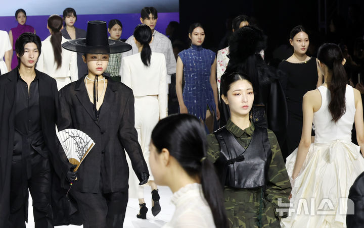 [부산=뉴시스] 하경민 기자 = '2025 패패부산(부산국제신발섬유패션전시회)·부산패션위크' 개막식이 열린 30일 부산 해운대구 벡스코 제1전시장에서 국내외 20개 브랜드가 참여하는 연합 오프닝 패션쇼가 펼쳐지고 있다.