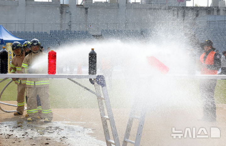 [인천=뉴시스] 전진환 기자 = 30일 오전 인천 서구 인천아시아드주경기장에서 열린 2025 인천광역시 의용소방대 소방기술경연대회에서 의용소방대원들이 화재진압 4인조법 분야 경연에 참가하고 있다. 2025.10.30. [email protected]