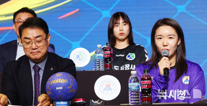 [서울=뉴시스] 박주성 기자 = 30일 서울 강서구 메이필드 호텔에서 열린 신한 SOL Bank 25-26 핸드볼 H리그 여자부 미디어데이에서 삼척시청 박세영 선수가 사회자 질문에 답하고 있다. 2025.10.30. [email protected]