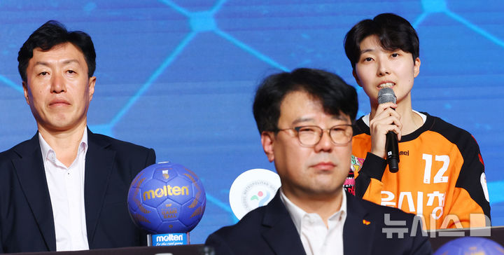[서울=뉴시스] 박주성 기자 = 30일 서울 강서구 메이필드 호텔에서 열린 신한 SOL Bank 25-26 핸드볼 H리그 여자부 미디어데이에서 서울시청 정진희 선수가 사회자 질문에 답하고 있다. 2025.10.30. [email protected]