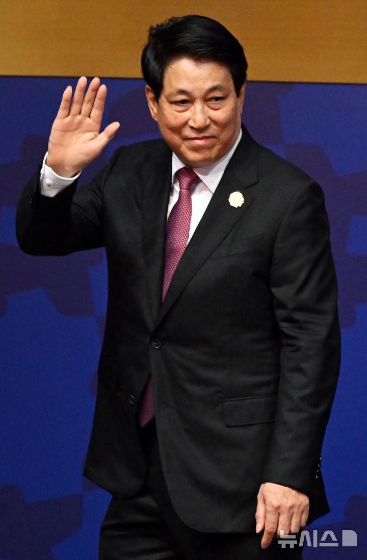 [경주=뉴시스] 추상철 기자 = 르엉 끄엉 베트남 국가주석이 30일 경북 경주시 경주예술의전당에서 열린 2025 아시아태평양경제협의체(APEC) 최고경영자(CEO) 서밋에서 정상 특별연설을 마친 후 손을 흔들고 있다. (공동취재) 2025.10.30. [email protected]