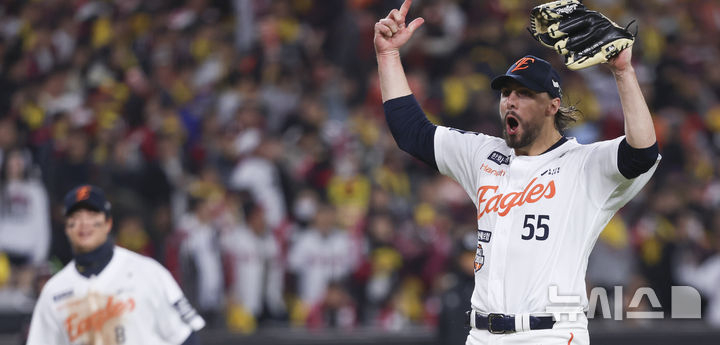 [대전=뉴시스] 김근수 기자 = 30일 대전 중구 한화생명볼파크에서 열린 2025 KBO 한국시리즈 4차전 LG 트윈스와 한화 이글스의 경기, 7회초 한화 선발 와이스가 1사 주자 1,2루 상황에서 LG 대타 문성주를 병살로 잡아내고 이닝을 종료하자 포효하고 있다. 2025.10.30. [email protected]