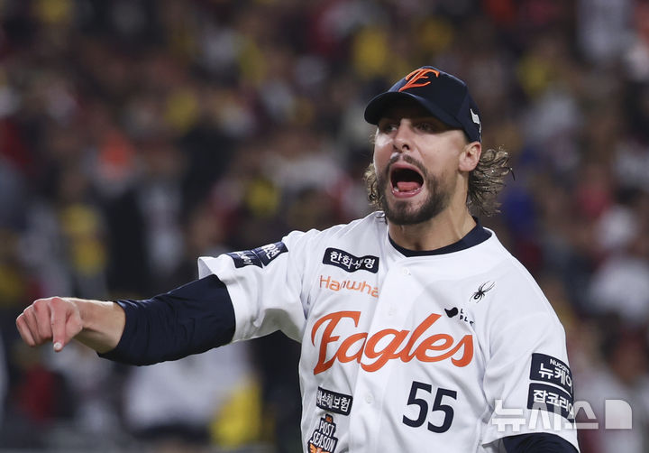 [대전=뉴시스] 김근수 기자 = 30일 대전 중구 한화생명볼파크에서 열린 2025 KBO 한국시리즈 4차전 LG 트윈스와 한화 이글스의 경기, 7회초 한화 선발 와이스가 1사 주자 1,2루 상황에서 LG 대타 문성주를 병살로 잡아내고 이닝을 종료하자 포효하고 있다. 2025.10.30. [email protected]
