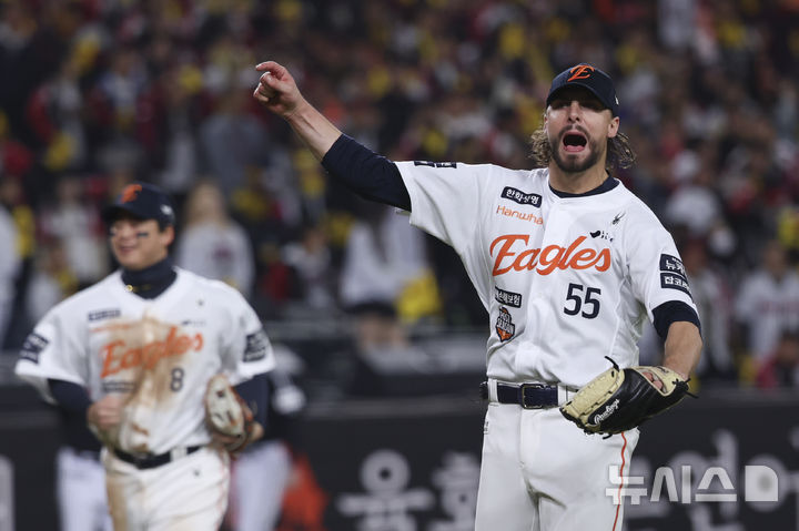 [대전=뉴시스] 김근수 기자 = 30일 대전 중구 한화생명볼파크에서 열린 2025 KBO 한국시리즈 4차전 LG 트윈스와 한화 이글스의 경기, 7회초 한화 선발 와이스가 1사 주자 1,2루 상황에서 LG 대타 문성주를 병살로 잡아내고 이닝을 종료하자 포효하고 있다. 2025.10.30. [email protected]