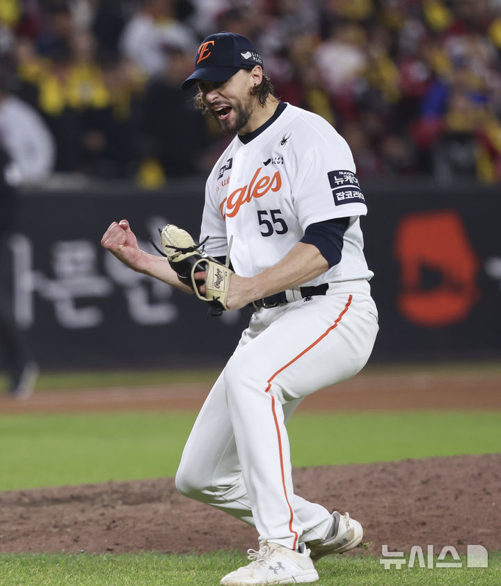 [대전=뉴시스] 김근수 기자 = 30일 대전 중구 한화생명볼파크에서 열린 2025 KBO 한국시리즈 4차전 LG 트윈스와 한화 이글스의 경기, 7회초 한화 선발 와이스가 1사 주자 1,2루 상황에서 LG 대타 문성주를 병살로 잡아내고 이닝을 종료하자 포효하고 있다. 2025.10.30. [email protected]