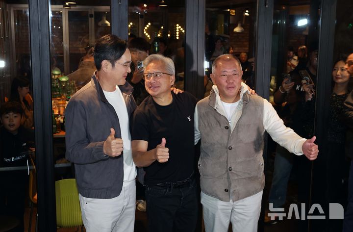 [서울=뉴시스] 정병혁 기자 = 이재용(왼쪽부터) 삼성전자 회장, 젠슨 황 엔비디아 최고경영자(CEO), 정의선 현대차그룹 회장이 30일 서울 강남구 삼성동의 한 치킨집에서 치맥 회동을 마친 뒤 기념촬영을 하고 있다. (공동취재) 2025.10.30. [email protected]