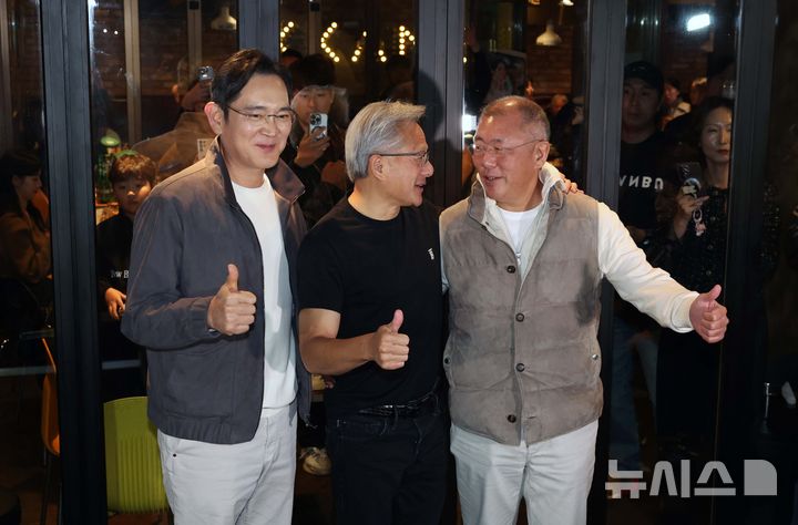 [서울=뉴시스] 정병혁 기자 = 이재용(왼쪽부터) 삼성전자 회장, 젠슨 황 엔비디아 최고경영자(CEO), 정의선 현대차그룹 회장이 30일 서울 강남구 삼성동의 한 치킨집에서 치맥 회동을 마친 뒤 기념촬영을 하고 있다. (공동취재) 2025.10.30. [email protected]