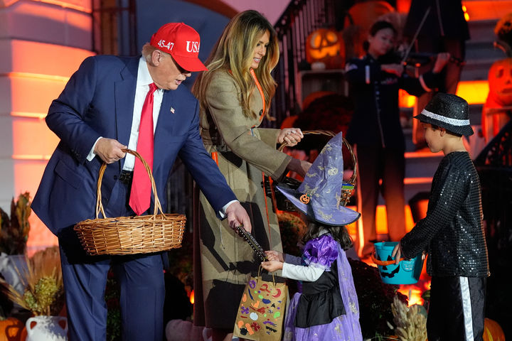 [워싱턴=AP/뉴시스] 도널드 트럼프 미국 대통령과 부인 멜라니아 여사가 30일(현지 시간) 워싱턴 백악관 남쪽 잔디밭에서 핼러윈 행사를 열고 어린이들에게 '트릭 오어 트릿' 사탕을 나눠주고 있다. 2025.10.31.
