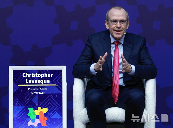 [경주=뉴시스] 추상철 기자 = 크리스토퍼 르베크 테라파워 대표가 31일 경북 경주예술의전당에서 열린 아시아태평양경제협력체(APEC) CEO 서밋에서 'AI시대 에너지 수요 증가와 지속가능 미래 차세대 원자력의 역할'를 주제로 발언하고 있다. (공동취재) 2025.10.31. [email protected]
