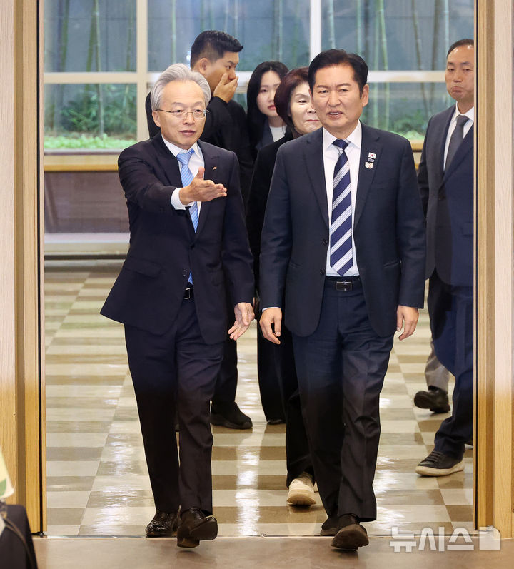 [서울=뉴시스] 김명년 기자 = 정청래 더불어민주당 대표와 최진식 한국중견기업연합회 회장이 31일 오전 서울 마포구 상장회사회관에서 열린 '더불어민주당-한국중견기업연합회 정책간담회에서 입장하고 있다. 2025.10.31. [email protected]