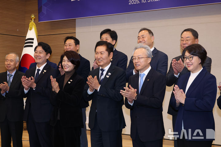 [서울=뉴시스] 김명년 기자 = 정청래 더불어민주당 대표와 최진식 한국중견기업연합회 회장이 31일 오전 서울 마포구 상장회사회관에서 열린 '더불어민주당-한국중견기업연합회 정책간담회에서 참석자들과 함께 기념촬영하고 있다. 2025.10.31. [email protected]