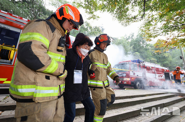 [서울=뉴시스] 황준선 기자 = 31일 서울 종로구 낙산공원에서 종로소방서 대원들이 담뱃불로 인한 산불 발생을 전제로 산불 발생에 따른 재난대응 유관기관 합동 종합훈련을 하고 있다. 2025.10.31. [email protected]